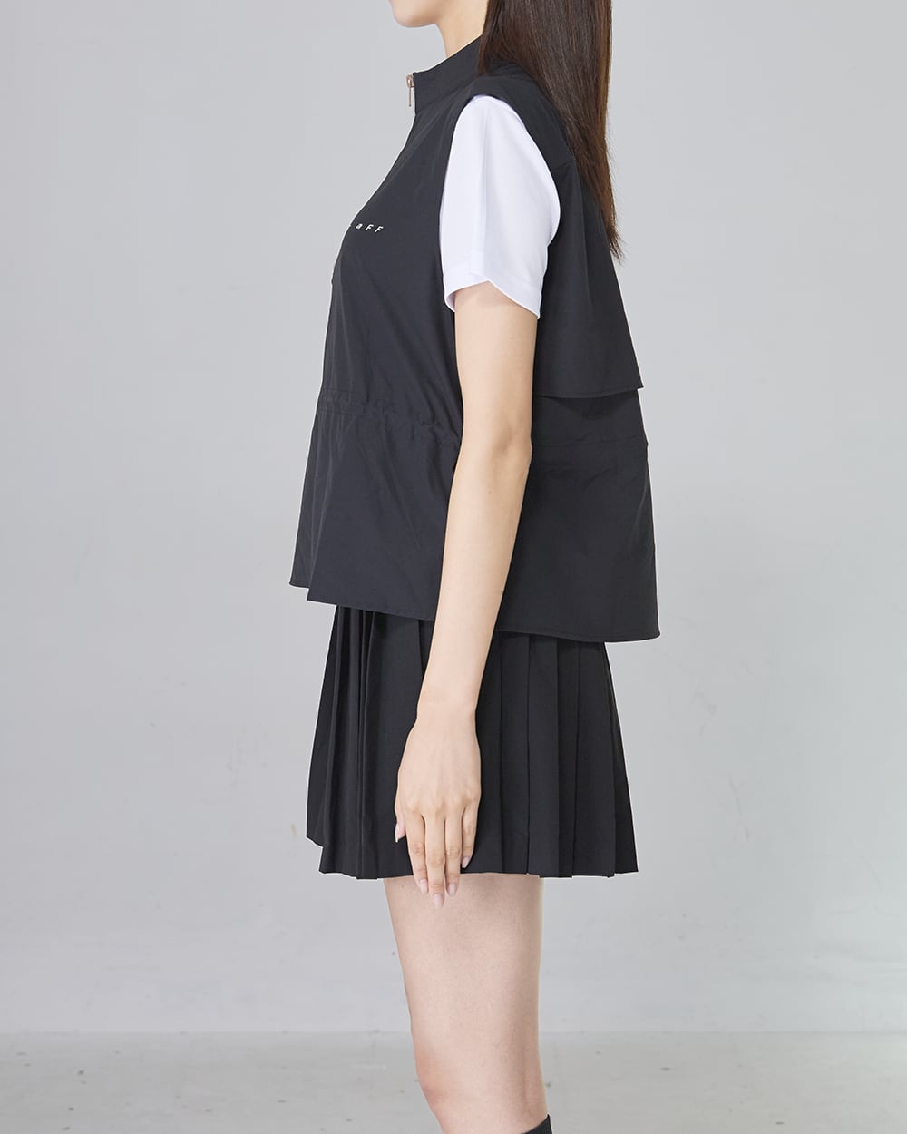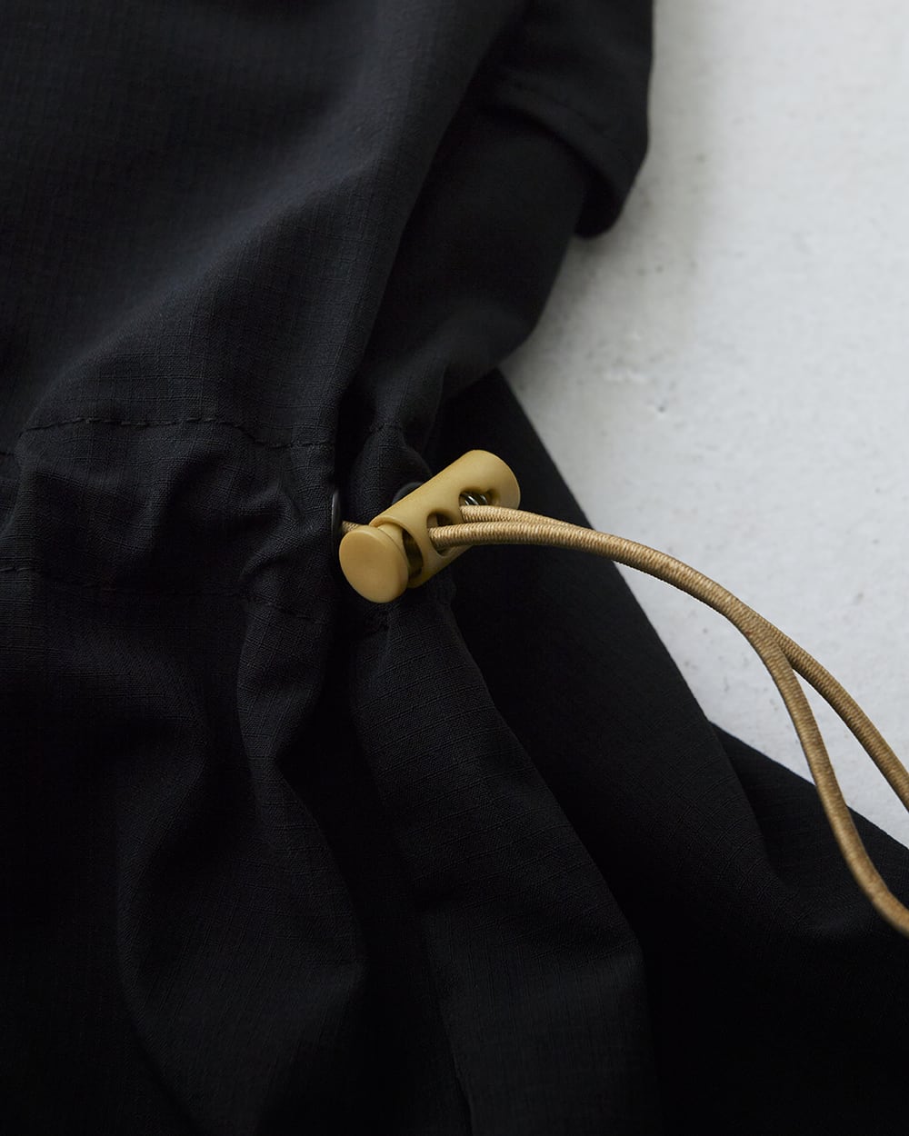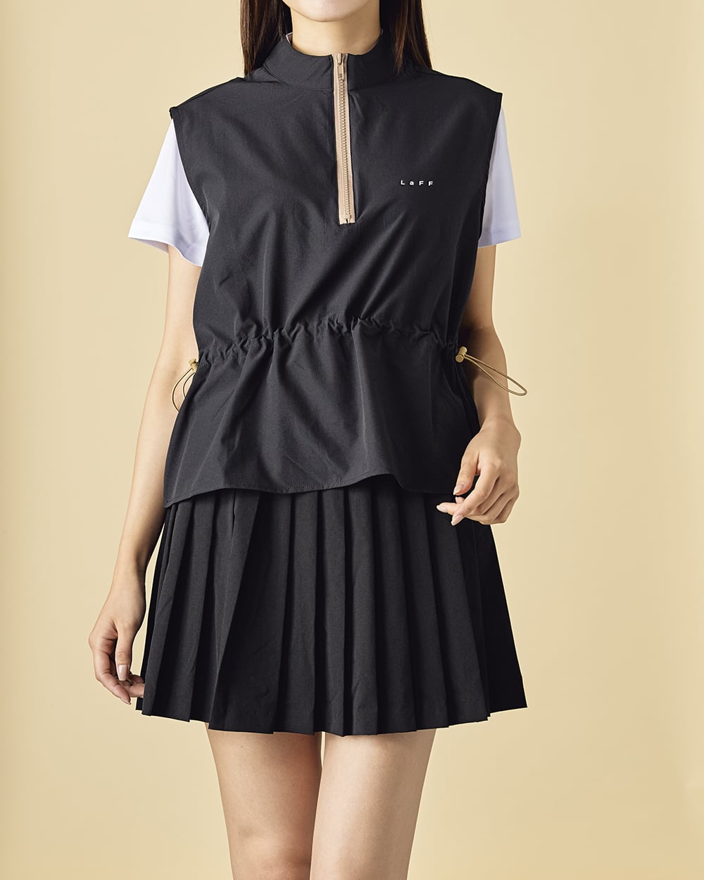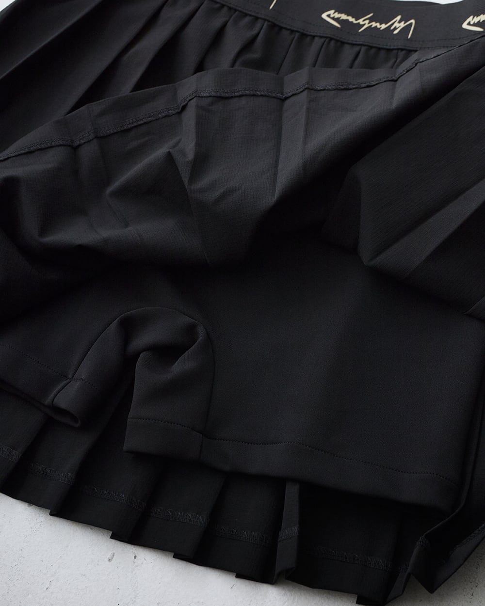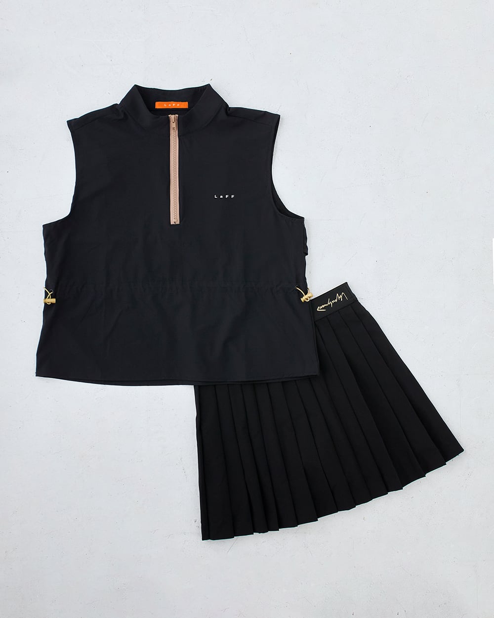 このセットアップの神髄は、トップスとスカートが織りなす完璧な高低バランスにあります。 トップスのドローストリングを絞ることで、視線をぐっと高い位置へ。そこから流れるように広がるプリーツスカートが、ウエストから脚先までを驚くほど長く、しなやかに見せます。セットアップだからこそ実現できるスタイルアップ効果を体感してください。