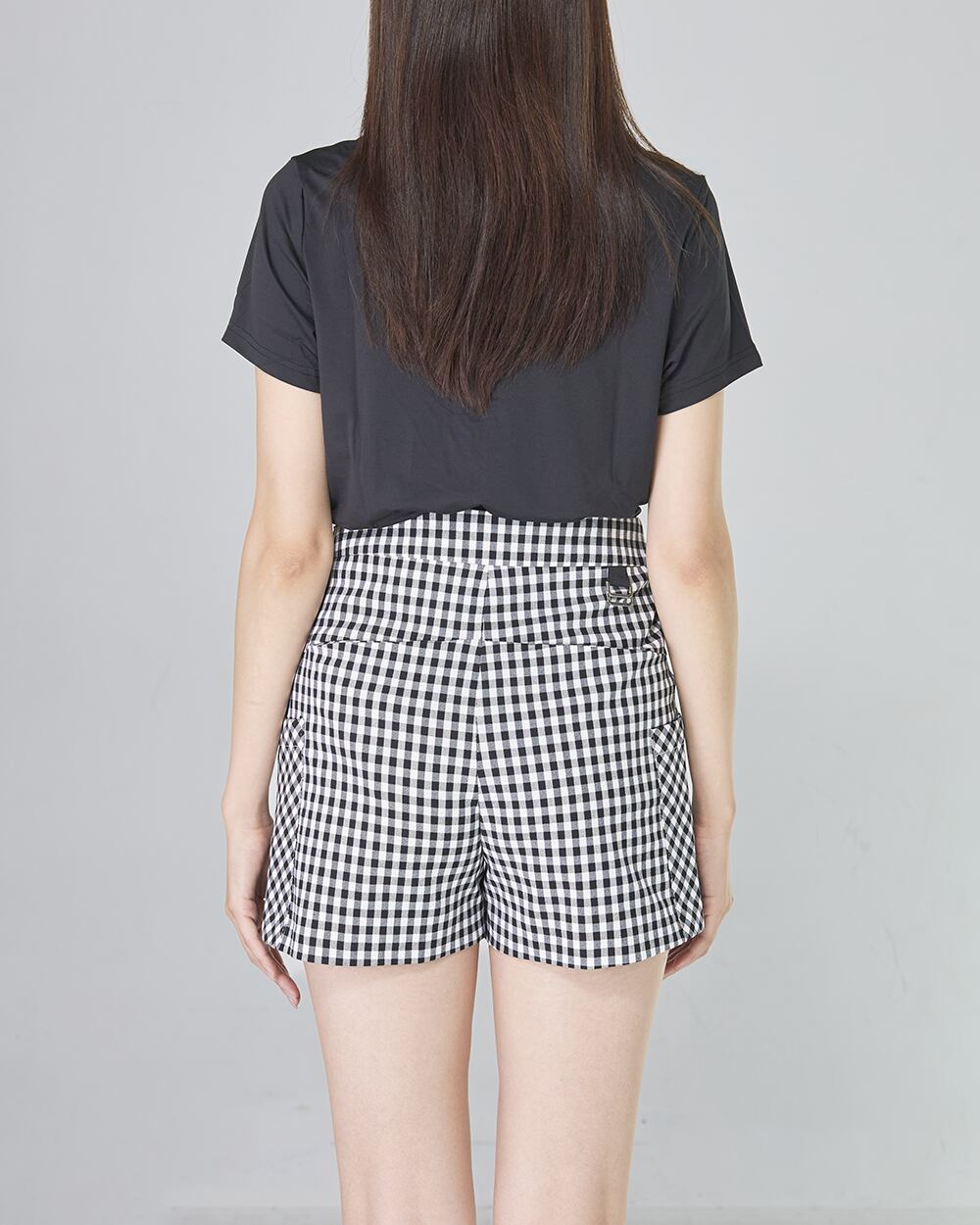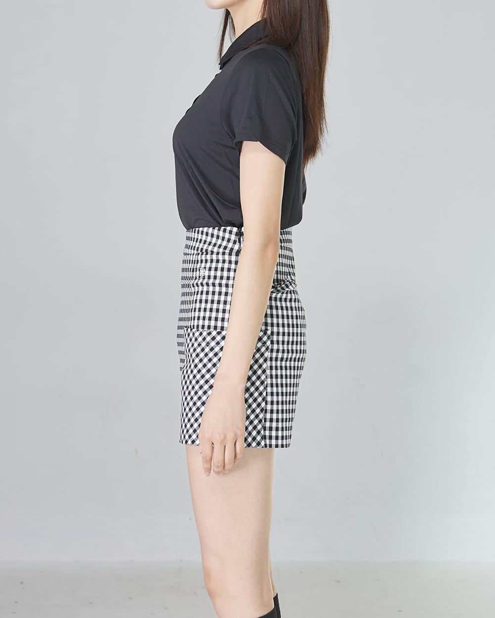 幅広のウエストラインが腰の位置を高く固定してプロポーションを整えつつ、あえて斜めに配したチェック柄の切り替えが腰回りのボリュームを視覚的に削ぎ落とします。正面から見た時の立体的な引き締め効果により、気になるヒップやお腹周りをスマートにホールド。 トップスをインした瞬間に「大人の黄金比」が完成し、ゴルフ場でも都会的で洗練された、ワンランク上の美しい佇まいを演出します。